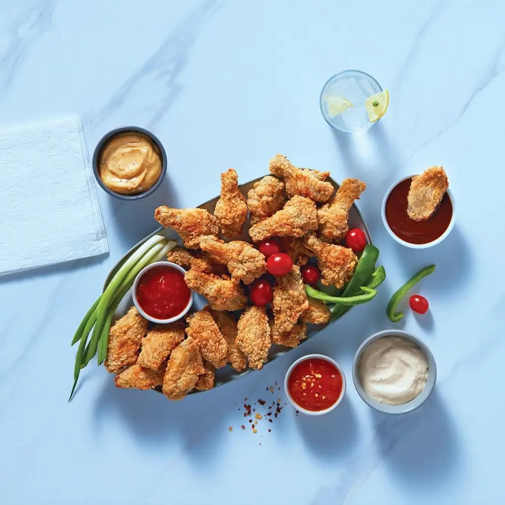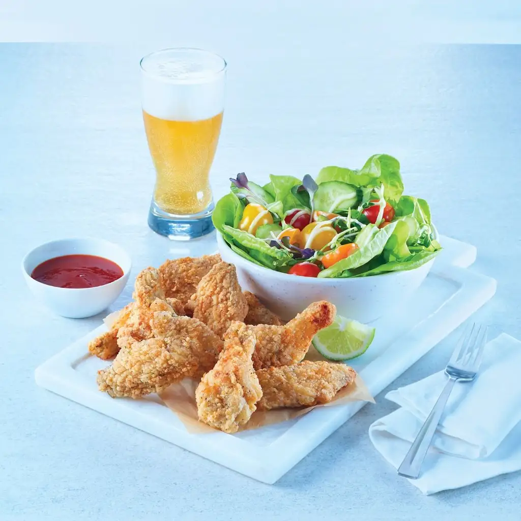Ailes de poulet coupées assaisonnées, enrobées et entièrement cuites. Produit de Thaïlande, Halal