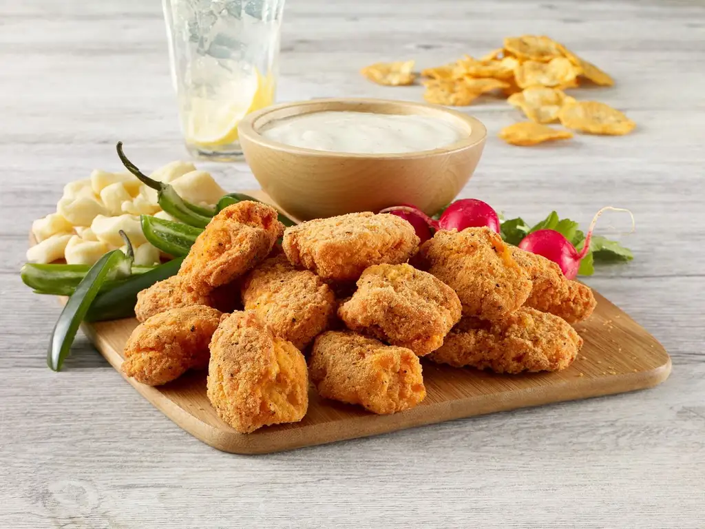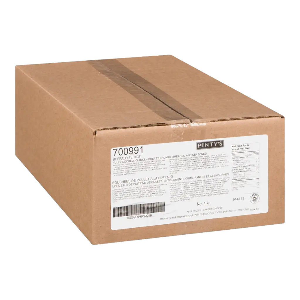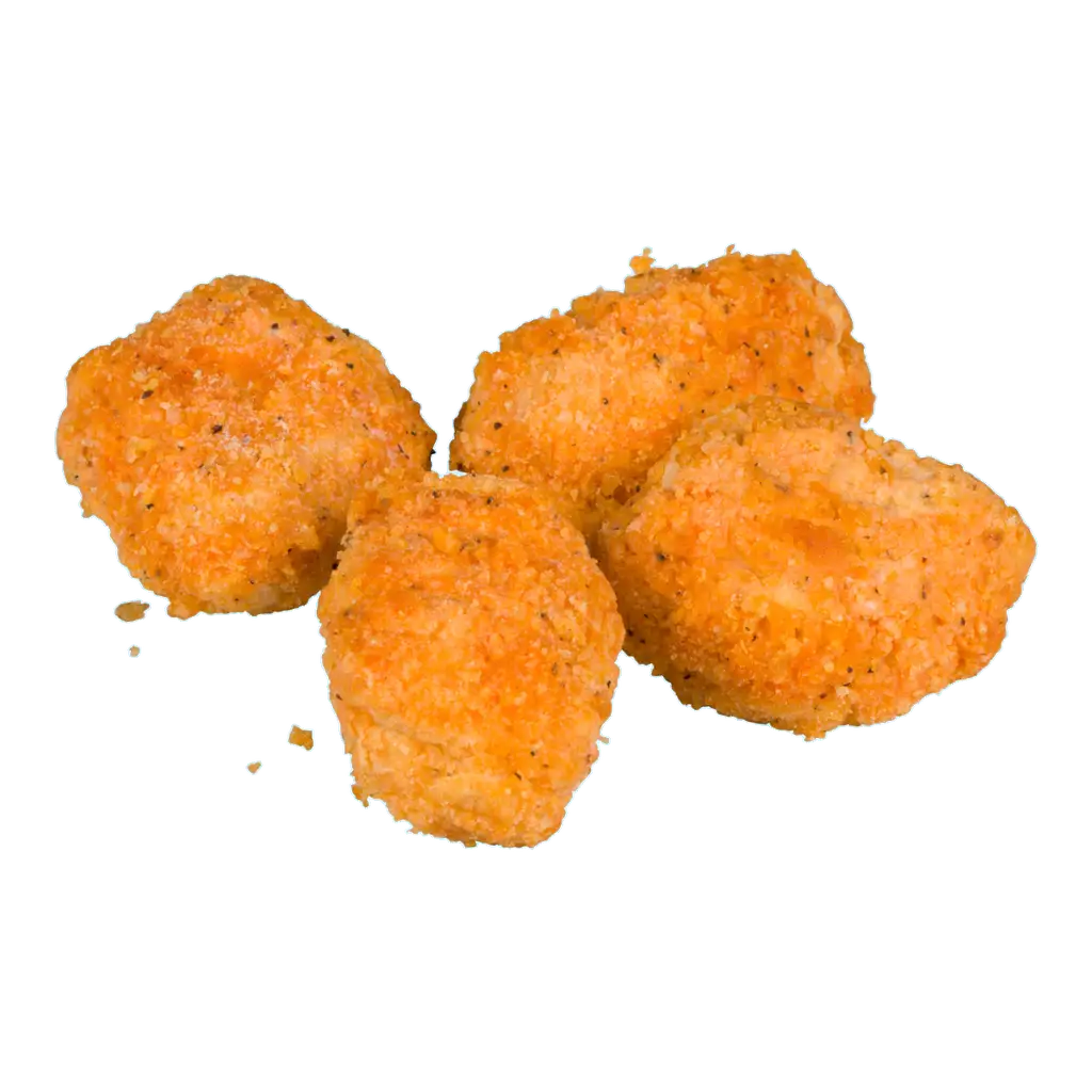 Bouchées de poulet à la Buffalo. Morceaux de poitrine de poulet entièrement cuits, panés et assaisonnés.