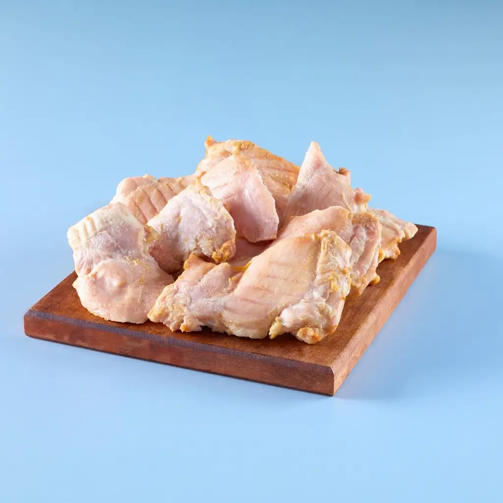Morceaux de hauts de cuisse de poulet - Désossés, sans peau, assaisonnés, entièrement cuits, Halal