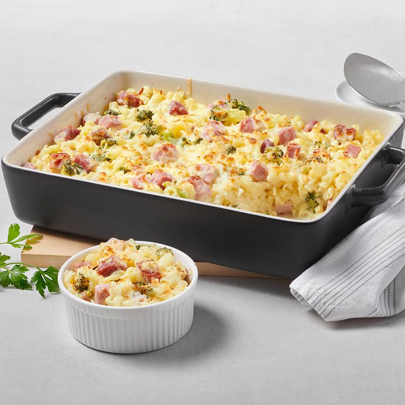 Macaroni gratiné au jambon, au fromage et au brocoli